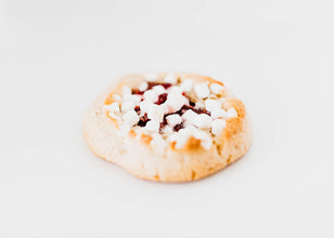 A soft sugar cookie base cradles a jewel-toned center of bright berry jam, topped with pillowy mini marshmallows that toast to golden perfection. Sweet, tart, and toasty all at once—this festive favorite tastes like the holidays wrapped in a warm, gooey bite.